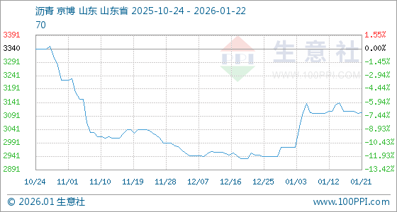 1月22日,生意社沥青基准价为3103.33元/吨,与本月初(2973.33元/吨)相比,上涨了4.37%。