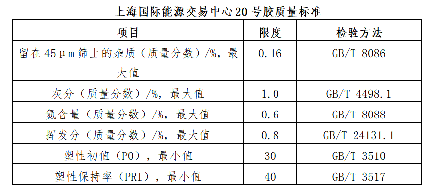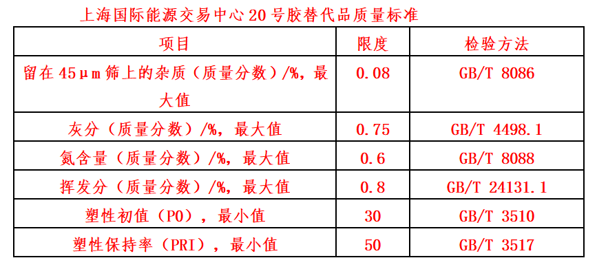 1.20号胶替代品可以用于20号胶实物交割,质量应当符合上海国际能源交易中心20号胶替代品质量标准。