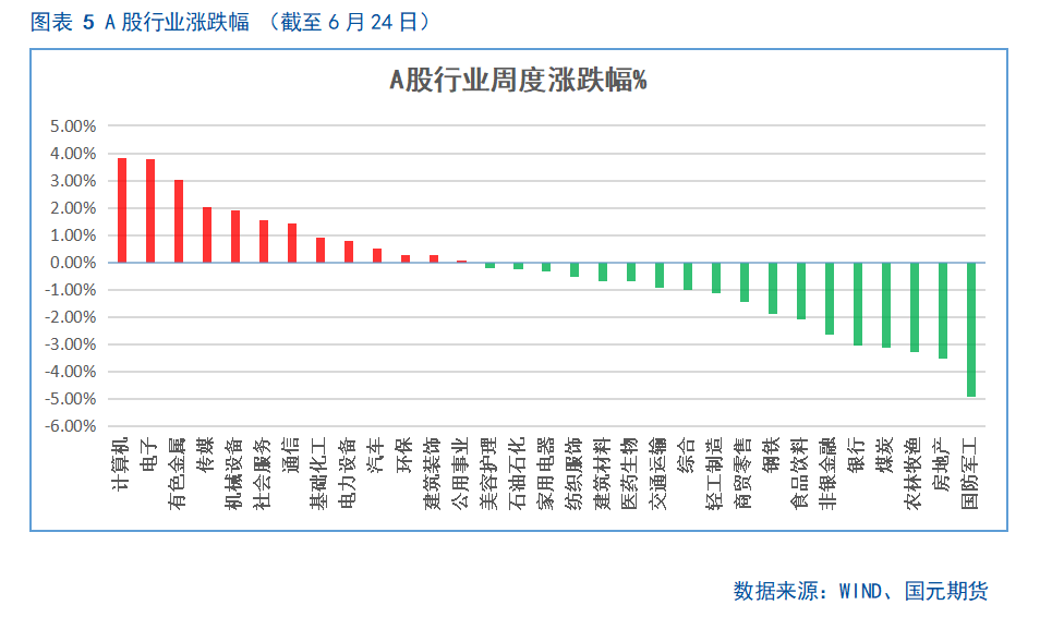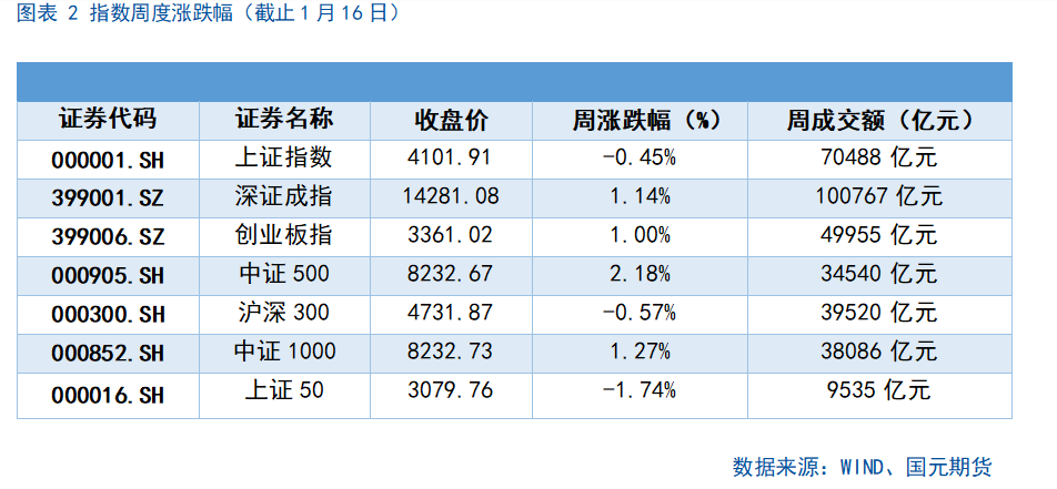 上周主要股指涨跌不一,深市涨幅超过1%,沪指小幅收跌,创业板涨1%。行情带动成交量上升,上周两市日均成交额超3万亿元。计算机、电子以及有色板块涨超3%;国防军工、房地产以及农林牧渔等板块跌幅较大。