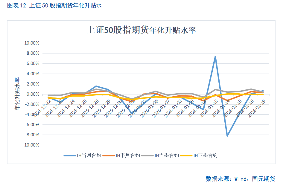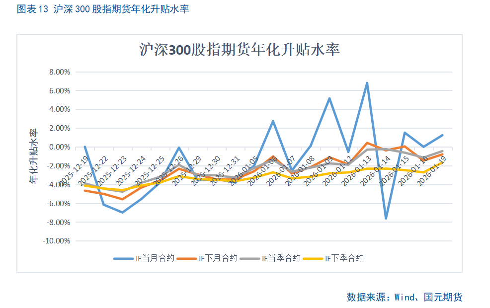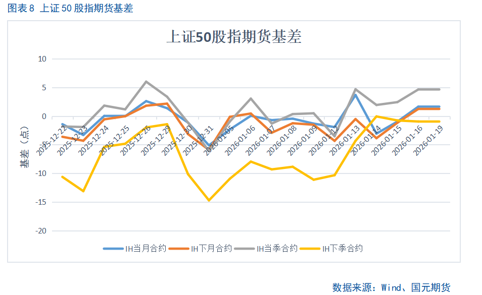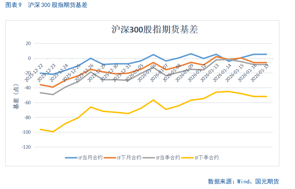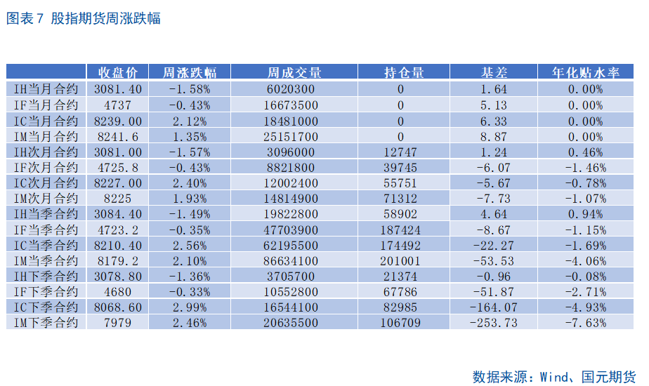 上周股指期货合约涨跌不一,IC以及IM大幅走高,IH以及IF回落。市场风险偏好较高。股指期货贴水近期较前期有所收敛,市场对后市信心较为充足。