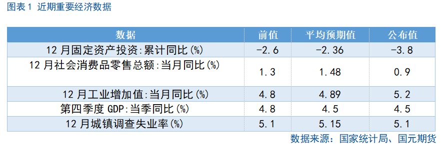 生产方面总量超预期、结构继续向装备/高技倾斜:12 月规上工业增加值同比+5.2%、环比+0.49%;分门类:采矿业+5.4%、制造业+5.7%、公用事业(电热气水)+0.8%。全年看,规上工业增加值+5.9%,其中装备制造业+9.2%、高技术制造业+9.4%;产品层面,官方口径提到 3D 打印设备、工业机器人、新能源汽车产量分别 +52.5%/+28.0%/+25.1%。