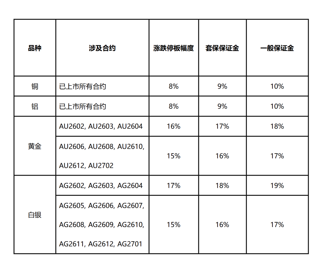 铜、铝、黄金、白银期货合约交易保证金比例和涨跌停板幅度又调整?速来查看