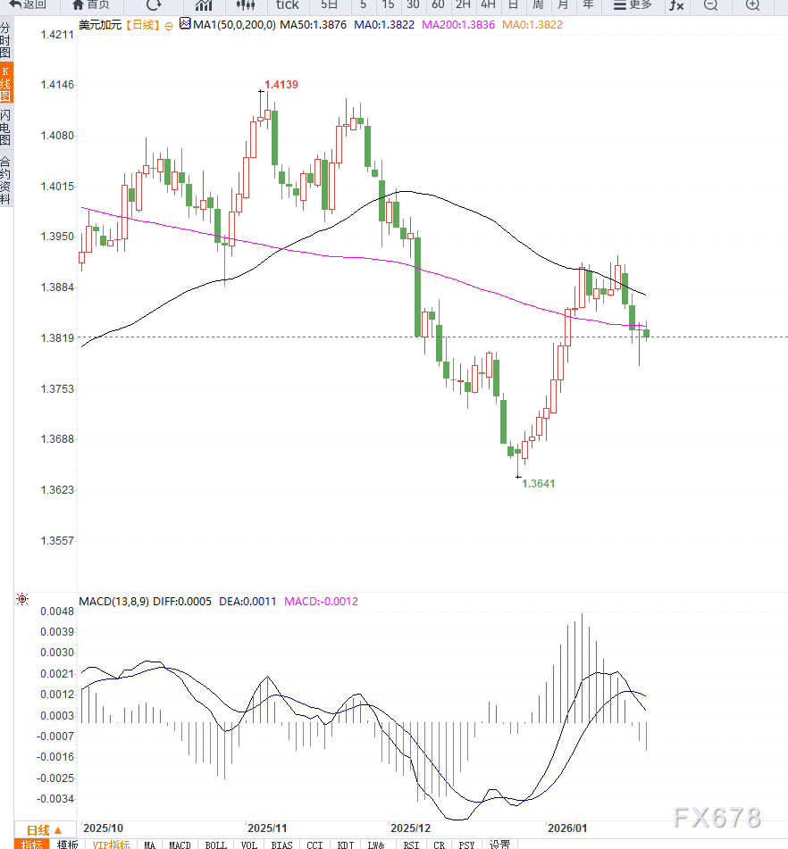 从技术面看,USD/CAD短线跌势延续,但尚未出现超跌信号。目前汇价在1.3800附近寻求支撑,若失守则可能进一步下探1.3750支撑区域;反之,若美元因美国经济数据强劲而反弹,上方阻力位关注1.3880和1.3920。