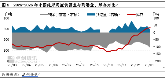 纯苯来看,其供需结构出现改善迹象。如图5所示,纯苯供需差(石油苯产量+加氢苯产量-下游消费量)扩大,截止1月15日纯苯供需差扩大至-10.96万吨,对比12月中旬-6.66万吨的供需差数值扩大了4.3万吨的国产供应缺口;而同时主港到货量也呈现下降趋势(图5所示),进一步说明纯苯供需结构出现边际改善。此外,从需求端来看,纯苯5大下游的周度产量数据显示,1月中旬开始己内酰胺、苯胺、酚酮等行业产量出现明显增加,苯乙烯与己二酸周度产量则高位稳定,供需端的变化均支撑纯苯供需结构出现改善。