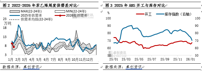 展望春节前后,苯乙烯供需结构或强于去年春节前后。如图4所示,春节前后苯乙烯供需差绝对值的高低值均低于去年同期,尤其是春节前夕,苯乙烯供需差显著低于过去四年的最低值,这主要得益于下游ABS行业的高负荷开工,且春节前后行业总产量显著高于一月份的平均水平。ABS周度产量数据来看,春节前后各两周时间内,ABS周度产量达到16.91万吨,较1月周度产量15.55万吨增加8.75%。