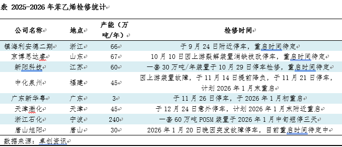 苯乙烯来看,供应及需求端均存利好,支撑其供需结构显著向好。如图2所示,10月中旬开始苯乙烯周度供需差(产量-三S消费量)不断下降,且阶段性处于2022-2024年均值水平下方,强劲的供需结构助推价格上涨幅度在出现利好因素时进一步扩大。具体利好因素来看,供应端主要是装置的计划外停车(详见下表),以及出口商谈的超预期增加(印度、韩国方向成交);需求端主要是随着苯乙烯价格的一路走高,下游三S,尤其是ABS市场贸易环节补空需求不断释放,支撑其厂库库存在开沟通负荷高位的情况下开始不断下降,如图3所示。