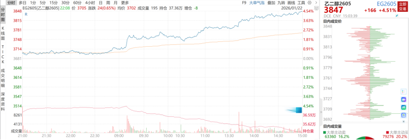 能源化工板块成为今日最大亮点,主力合约方面,丁二烯橡胶涨4.69%至12,270元/吨,苯乙烯涨4.07%至7694元/吨,乙二醇涨4.51%至3847元/吨,主因节前备货需求集中释放、油厂挺价意愿增强,叠加原油涨1.20%带动成本端上行。