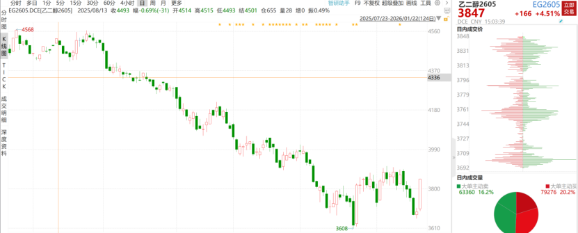 当日,乙二醇期货主力合约收盘3,847元/吨,较前一日大涨4.51%;基差-172元,基差率-4.68%,较前一日负向扩大,期货升水现货格局进一步加剧。