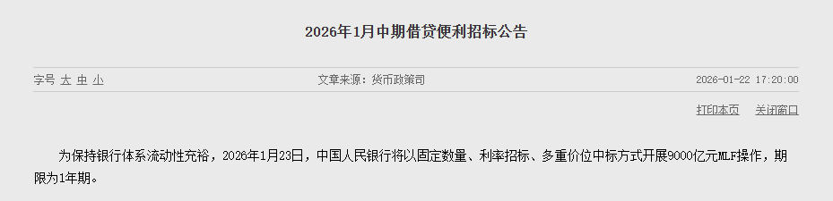 中国人民银行1月22日消息,为保持银行体系流动性充裕,2026年1月23日,中国人民银行将以固定数量、利率招标、多重价位中标方式开展9000亿元中期借贷便利(MLF)操作,期限为1年期。