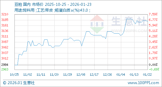 1月23日,生意社豆粕基准价为3180.00元/吨,与本月初(3126.00元/吨)相比,上涨了1.73%。
