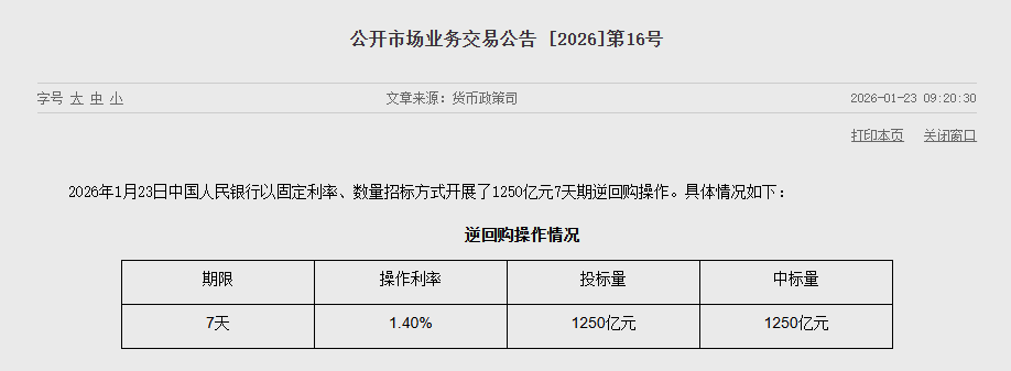 1月23日,央行今日开展1250亿元7天逆回购操作,投标量1250亿元,中标量1250亿元,操作利率为1.40%,与此前持平。