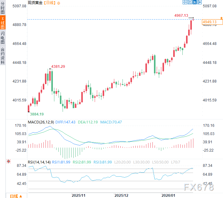 周五亚市时段,现货黄金震荡上行,现交投于每盎司4950美元附近,早盘时段一度触及4967.13美元/盎司的历史新高,日内涨幅约0.3%。