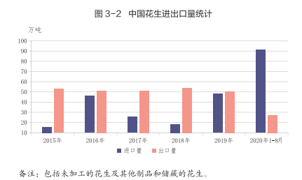 尽管全球花生贸易量相对较小,但国际市场花生价格的变化会引起贸易量变化,进而影响到国内花生价格的变化。我国是传统的花生生产大国,整体看基本处于自给自足状态。据海关数据显示,2009年之前,我国花生进口量一直维持在1万吨以下。2015-2019年,五年出口量均维持在50万吨左右;进口量则波动较大,每年从20万吨到50万吨不等。但2020年,由于我国花生价格较高,花生出口量减少,而花生进口量在大幅增加,大量低价花生的进口在一定程度 上冲击了国内花生市场。随着国内花生消费的增加及一带一路等政策的影响,预计花生进口量仍有一定的上升空间。