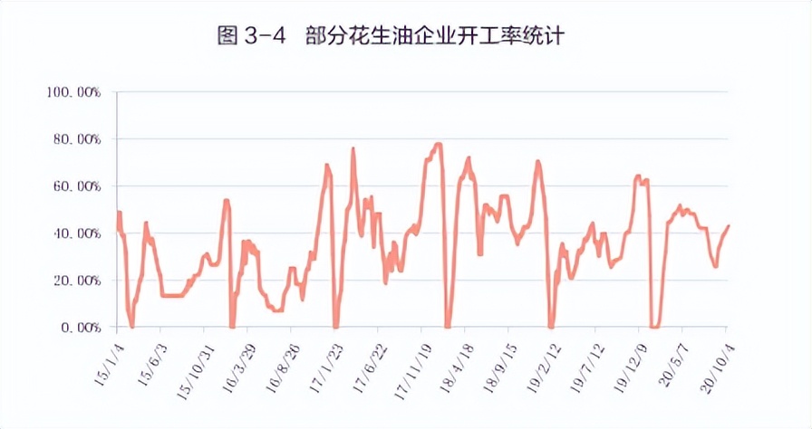 由于花生收购的季节性较强,且保管困难,国内花生压榨企业普遍采用集中收购集中压榨的模式,油厂开机呈现较强的季节性。国内花生压榨企业一般在当年四季度和来年一季度开工率相对较高,对花生的需求量相对较大,对花生价格有支撑作用。
