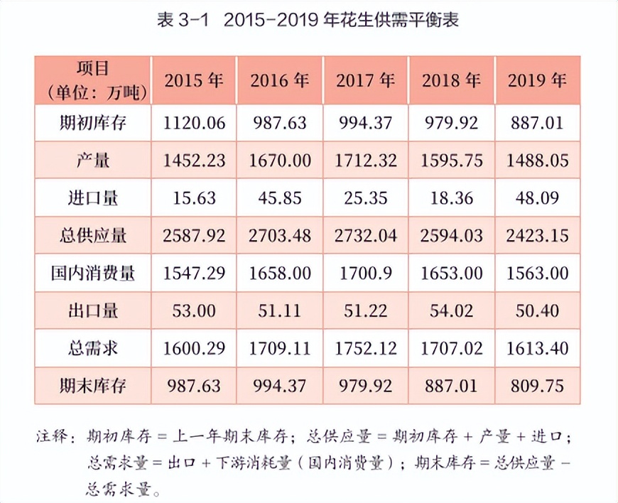 2011年,我国花生产量首次超过大豆,成为国内最大的油料作物。从供给角度来看,总量方面,油用花生总供给量与当年花生产量及进口量呈正相关;结构方面,由于油用与食用花生在本质上无明确区别,存在替代关系,因而油用花生供给与食用花生供给呈负相关。从需求角度来看,油用花生下游产品为花生油与花生粕,其需求来自油脂销售及饲料生产。