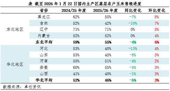 截至1月22日,东北产区平均售粮进度为55%,较去年同期偏慢4个百分点。随着市场价格涨至阶段性高点、春节假期临近,产区基层农户惜售情绪松动,以及下游加工企业进入节前备货阶段,部分贸易环节建库意原提升,基层售粮进度加快。但干粮价格偏高,销区接受度不高,实际成交量维持低位,市场供应增量不足。