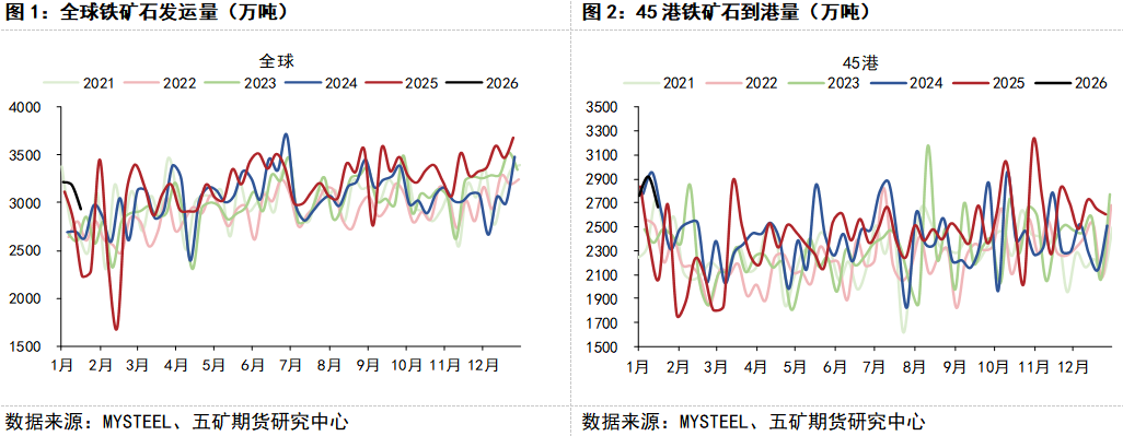 从供应端来看,海外主流矿山发运已逐步进入季节性淡季窗口期。近期澳洲及巴西发运量较此前高位有所回落,周度发运数据连续下降。国内港口到港量仍维持在相对高位,首船西芒杜铁矿石也已在2026年1月17日运抵中国港口。到港量偏高主要为此前2025年末冲量发运带来的集中兑现,预计到港释放后将环比回落。