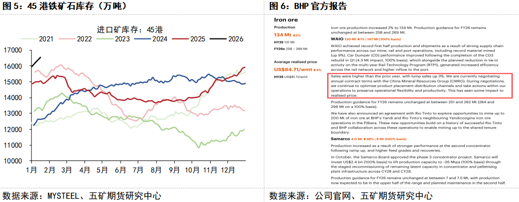 当前铁矿石45港进口矿库存在1.65亿吨以上,为近五年同期新高,库存总量压力存在。受年度合同谈判影响,中品矿库存结构性偏强,在过去一段时间内强化了铁矿石的现货价格支撑。近期BHP在年度谈判中的态度变化值得关注。相较以往相对强势的定价立场,BHP在官方报告中表示其正在与中国矿产资源集团(CMRG)协商年度合同条款,并持续优化产品分销渠道并采取行动维护经营灵活性与生产力。若后续谈判中主流矿山在部分品类和条件上出现松动,预计将释放出对铁矿石价格继续上行的降温预期,同时如果库存结构性问题连带解决,库存总量压力也面临释放窗口。