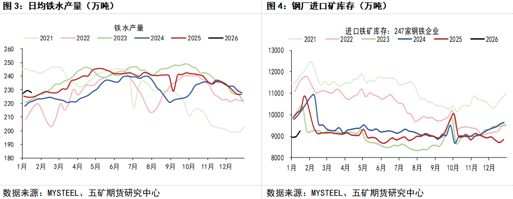 生产方面,前期随着高炉年检陆续完成,复产推进,铁水一度出现回升。2026年1月18日,包钢板材厂发生爆炸事故。根据官方最新通报,本次事故造成10人死亡,84人受伤。目前事故厂区已全面停止生产。另据SMM调研,包钢计划从1月19日起对部分高炉实施停产检修,工期约3个月,预计影响日均铁水产量1.59万吨。安全生产事件往往通过影响开工率和产能利用率,间接作用于炉料需求,且一般而言,事故因素不会改变中长期供需格局。但是,短期来看,受突发事故及安全监管影响,铁水复产节奏将被动调整,铁水产量恢复预计低于此前预期,对铁矿石需求产生边际负面影响。
