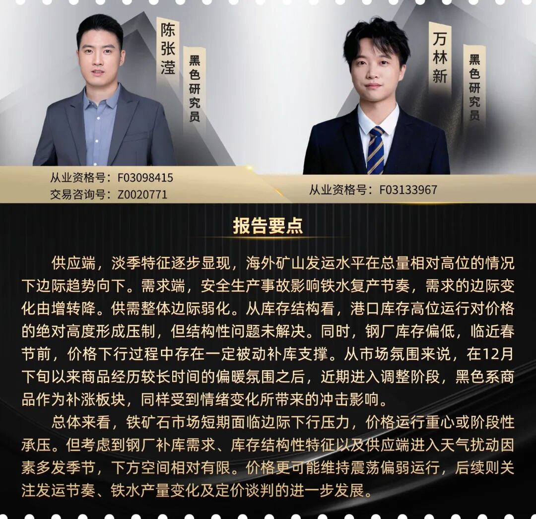 综合供需及市场氛围情况来看,当前铁矿石市场处于边际调整阶段。供应端,淡季特征逐步显现,海外矿山发运水平在总量相对高位的情况下边际趋势向下。需求端,安全生产事故影响铁水复产节奏,需求的边际变化由增转降。供需整体边际弱化。从库存结构看,港口库存高位运行对价格的绝对高度形成压制,但结构性问题未解决。同时,钢厂库存偏低,临近春节前,价格下行过程中存在一定被动补库支撑。从市场氛围来说,在12月下旬以来商品经历较长时间的偏暖氛围之后,近期进入调整阶段,黑色系商品作为补涨板块,同样受到情绪变化所带来的冲击影响。