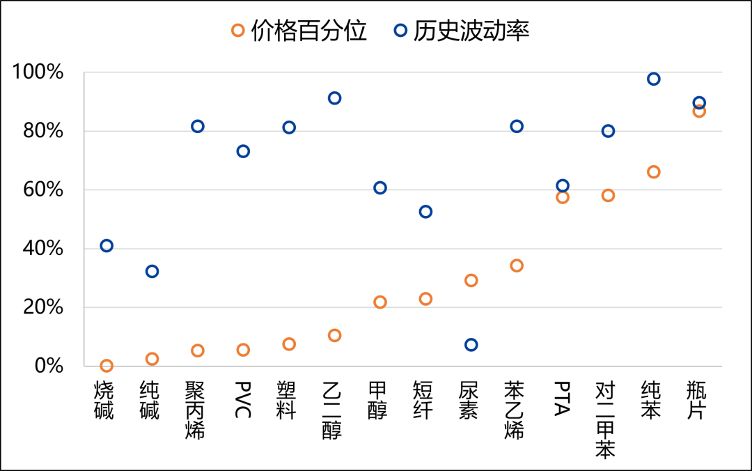 价格与波动率一般都呈现周期性变化,若期货价格与波动率均偏低,一旦上涨行情出现,会呈现“空间巨大并且程度剧烈”的特征。当前烧碱、纯碱、PP、PVC、塑料和乙二醇的期货价格低于过去五年10%分位水平,尿素和纯碱的历史波动率偏低,年内出现大级别行情的可能性更高。