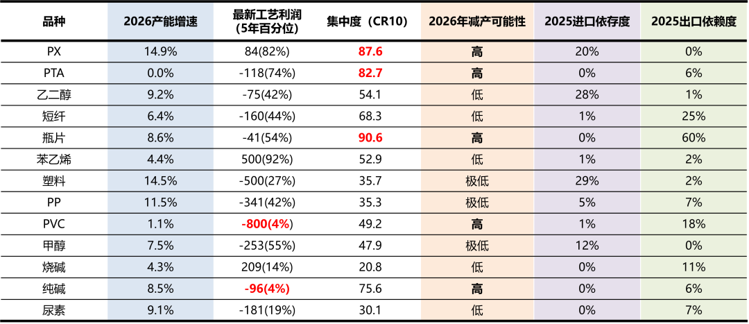 2026年多数化工品的新产能投放节奏放缓,仅PX、塑料、PP、纯碱和尿素的新增产能较多,并且这些新增产能集中在下半年投放,上半年尤其是前四个月基本处于投产真空期。产能增速最低的分别是PTA、PVC和烧碱,这三个品种产能过剩,正在经历产能优化的周期。另外值得一提的是,老旧产能多已经旧改或提前淘汰,今年反内卷政策不会导致产能发生实质性变化。