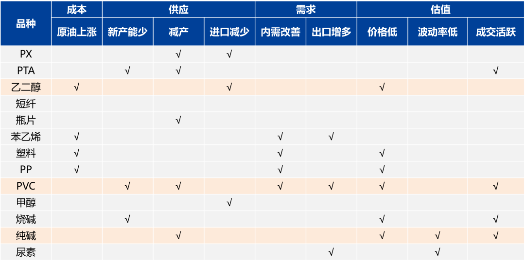 综合考虑“成本、供应、需求和估值”四类核心驱动,我们认为上半年PVC、纯碱和乙二醇具备较大上行空间,推荐做多05或09合约,此外尿素、纯碱和烧碱的隐含波动率偏低,也适合买入深度虚值看涨期权,以高赔率和低成本弥补低胜率。
