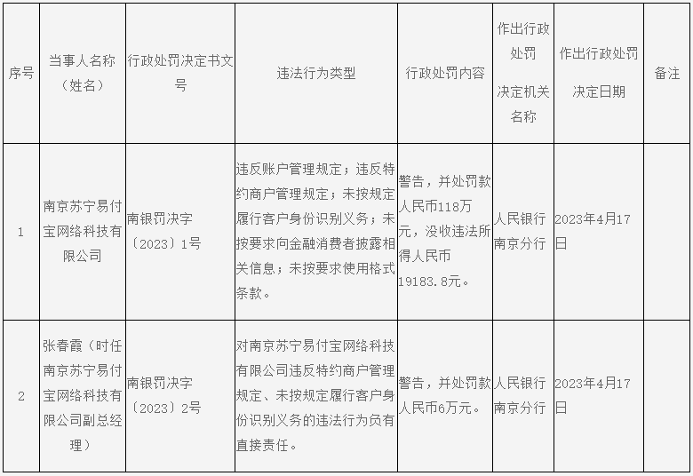 值得注意的是,2022年以来苏宁易付宝曾三遭行政处罚。其中,2023年4月21日,中国人民银行南京分行公示了一张南京苏宁易付宝网络科技有限公司(“苏宁易付宝”前身)的罚单:因违反账户管理规定、违反特约商户管理规定、未按规定履行客户身份识别义务、未按要求向金融消费者披露相关信息等被罚118万元,没收违法所得人民币19183.8元。