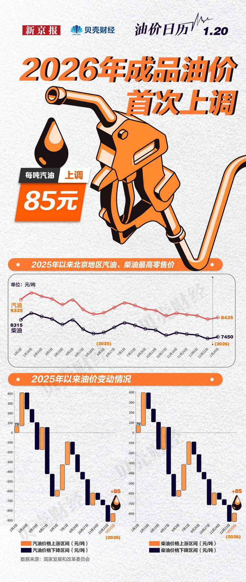 据国家发展和改革委员会消息,自1月20日24时起,国内成品油零售价格迎来2026年首次上调。国内汽、柴油价格(标准品)每吨均上调85元。折合成升价,每升92号汽油、95号汽油和0号柴油均上调0.07元。本次调价过后,2026年成品油调价将呈现“一涨零跌一搁浅”的格局。北京地区汽油最高零售价8435元/吨,柴油7450元/吨。