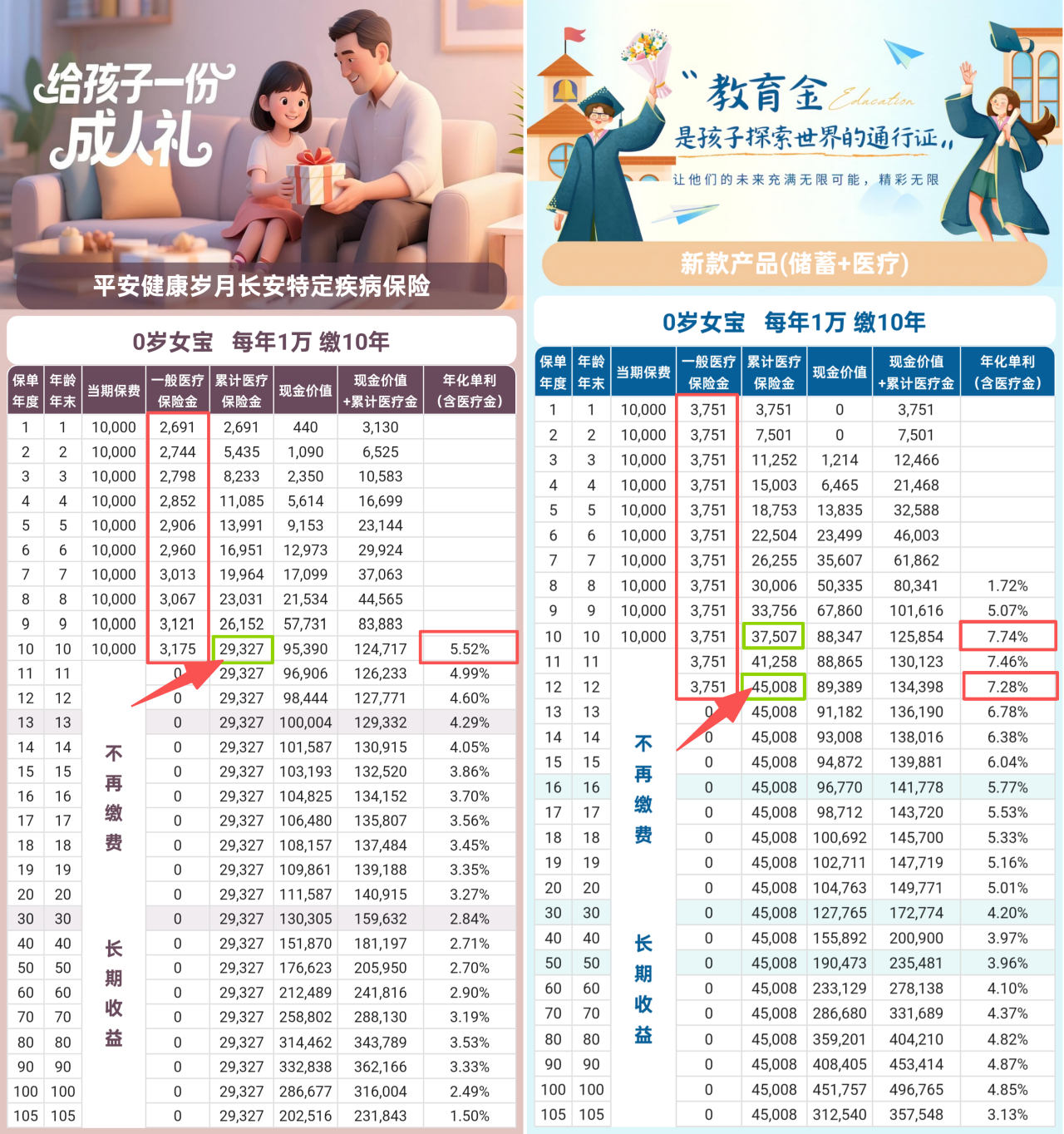 以0岁女宝,年交1万,交10年为例: