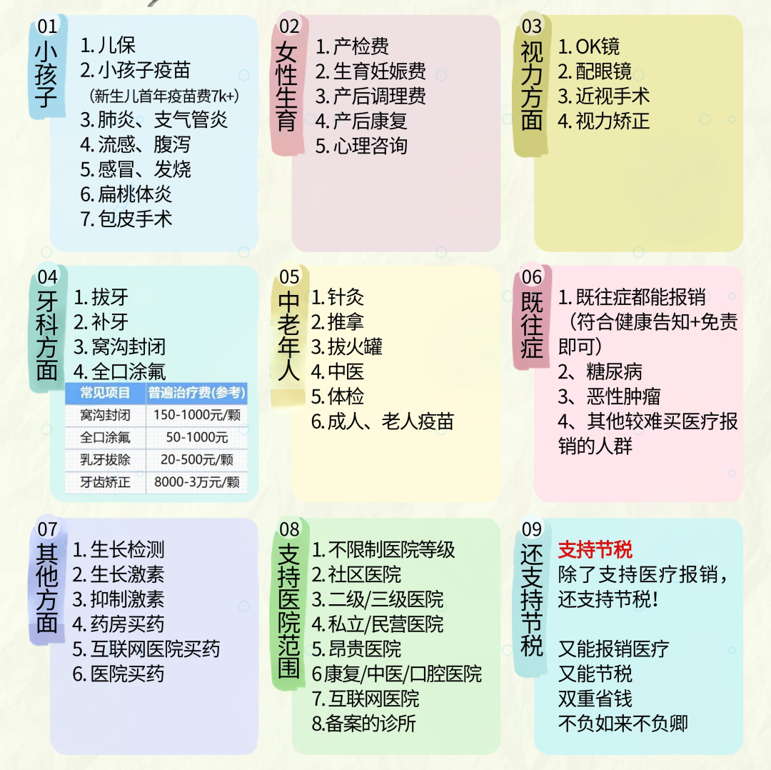 不像百万医疗险有1万免赔额,这个账户主打一个“实用”。感冒发烧门诊、体检、看牙、配眼镜、甚至线上买药通通能报!