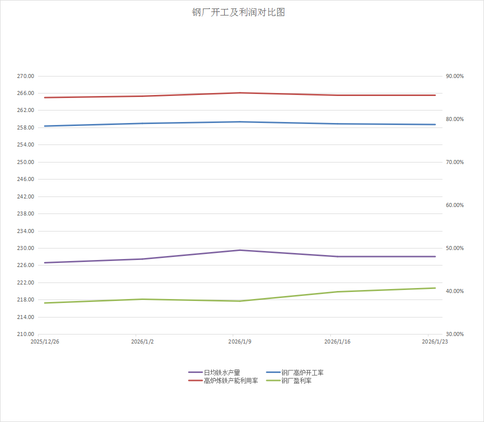 需求方面,截至1月23日,钢厂高炉开工率78.68%,周环比下降0.16%;高炉炼铁产能利用率85.51%,周环比上升0.03%;钢厂盈利率40.69%,环比增加0.86%;日均铁水产量228.1万吨,环比增加0.09万吨;当前样本钢厂的进口矿日耗为281.9万吨,环比增加0.05万吨。本周钢厂钢厂开工情况继续下行,钢厂利润有所恢复但铁水产量走稳,下游成材成交不佳导致钢厂开工积极性受挫,下周钢厂虽仍有复产,但现货成交情况难料,钢厂利润或有下降可能,利空钢厂需求释放,预计下周铁矿需求释放或小幅缩减。