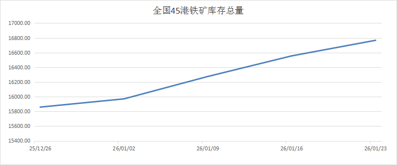 库存方面,截至1月23日,全国45个港口进口铁矿库存为16766.53万吨,环比增加211.43万吨;日均疏港量为310.73万吨,周环比下降9.16万吨;在港船舶数122条,周环比增加2条。本周铁矿港口库存情况如上图;全国钢厂进口铁矿库存总量为9388.82万吨,周环比增加126.6万吨。本周钢厂利润有所恢复,但铁水产量平稳因为钢厂有意放缓需求释放所以疏港量下行。本周港口库存量维持累库,虽然海外发运缩减但钢厂需求也同步缩减,下周港口库存累库趋势维持,下周仍需要多关注港口铁矿库存变化。