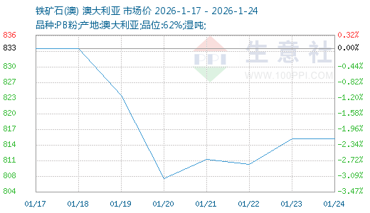 据生意社商品行情分析系统显示,本周(1.17-1.24,下同)铁矿价格震荡上行,趋强运行。截至24日,生意社铁矿价格指数为816.67,环比下行2.07%,具体如上图。本周铁矿价格震荡下行行、趋弱运行,其主要原因是本周黑色系呈现“宏观驱动、成材引领”格局。前半周贵金属独涨,凸显避险与降息预期,工业品受制于弱现实。后半周宏观利好(如地产政策)激发全市场乐观情绪,但结构分化显著:需求预期推动成材率先反弹,而铁水复产缓慢压制原料现实需求,铁矿等原料仅跟随成材上涨,行情由“强预期”传导而非产业主动补库驱动。核心矛盾在于政策暖风能否兑现为扎实的需求回暖。