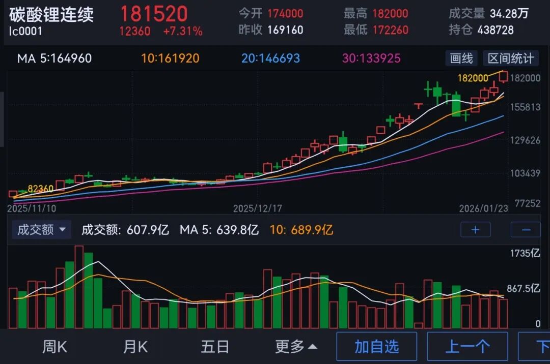 本周,碳酸锂期货价格持续上扬,突破180000元/吨大关,创阶段性新高。截至1月23日收盘,主力合约价格报收181520元/吨。
