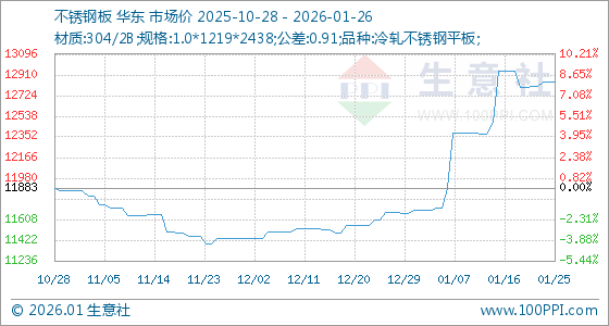 1月26日,生意社不锈钢板基准价为12850.00元/吨,与本月初(11691.67元/吨)相比,上涨了9.91%。