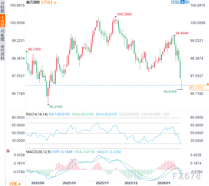 周一亚市时段,美元指数震荡下行,现交投于97.15附近,日内跌幅约0.35%,此前一度触及96.94的超四个月低点。