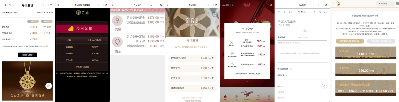 具体而言,当日,周生生足金饰品境内价格为1574元/克,单克较1月5日上涨198元;老庙黄金上海区域价格为1575元/克,单克较1月5日上涨198元;六福珠宝足金999/足金境内价格为1576元/克,单克较1月5日上涨200元;周大福足金(饰品、工艺品类)、谢瑞麟足金饰品、潮宏基足金(首饰摆件)境内价格为1578元/克,单克较1月5日上涨200元。