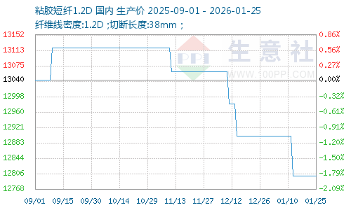 据生意社商品行情分析系统监测,上周(2026年1月19日至25日),粘胶短纤厂商执行前期价格为主,价格弱势平稳。截至2026 年 1 月 25 日,粘胶短纤市场均价为 12800元 / 吨,较前期价格持平,市场整体成交节奏平缓。