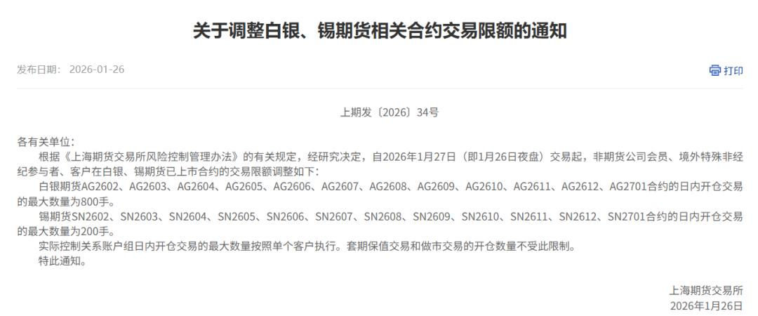 根据通知,自2026年1月27日(即1月26日夜盘)交易起,非期货公司会员、境外特殊非经纪参与者、客户在白银、锡期货已上市合约的交易限额调整如下: