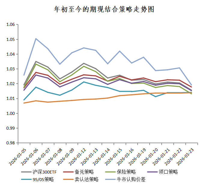 我们对期现结合的六个策略(备兑、保险、领口、95/05配置、卖认沽、牛市认购价差)及沪深300ETF现货,在上周(2026.1.19-2026.1.23)的表现进行了回测。上周沪深300ETF下跌,卖认沽策略表现较好。具体结果如下: