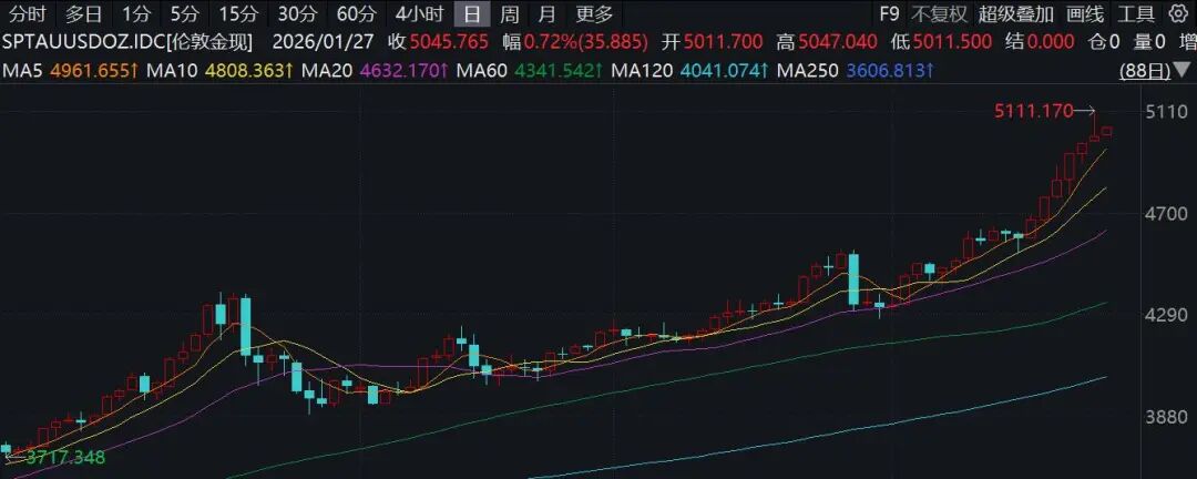 分析称,受政治与财政风险上升推动,投资者转向避险资产。1月26日黄金价格一度大涨2.5%,创下每盎司5100美元以上的历史新高。现货白银日内涨幅一度高达14%,最高触及117美元/盎司。不过国际金银在冲高后大幅跳水,现货白银尾盘转跌,报约102.8美元/盎司。现货黄金向下跌破5000美元/盎司,收涨0.26%。