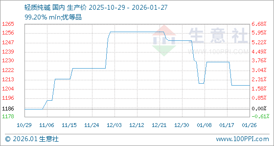 1月27日,生意社轻质纯碱基准价为1208.00元/吨,与本月初(1250.00元/吨)相比,下降了3.36%。