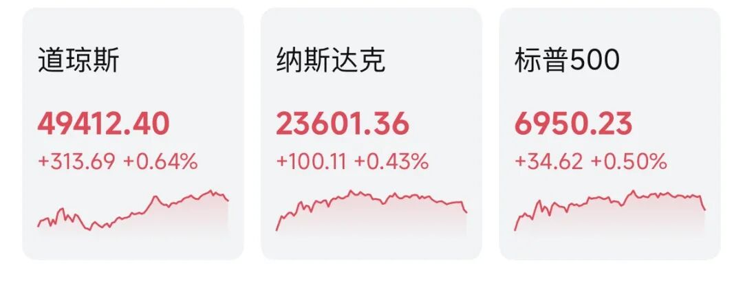1月27日,市场消化最新经济数据,投资者情绪较正面,美股三大指数稳健走高。截至收盘,道指涨0.64%,报49412.4点;标普500指数涨0.5%,报6950.23点;纳指涨0.43%,报23601.36点。
