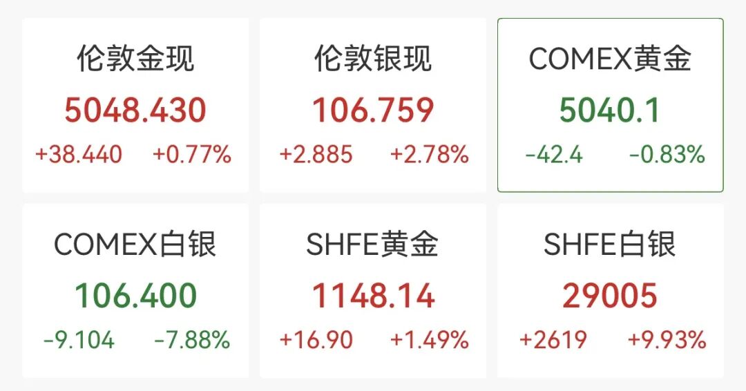 盘中,黄金史上首次突破5000美元/盎司,涨超2%。截至发稿,涨幅有所回落,COMEX黄金期货报5040.1美元/盎司,跌0.83%。