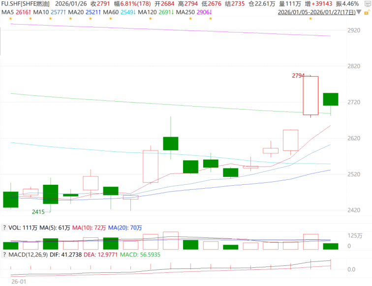 2026年1月26日,国内原油SC、低硫燃油LU涨超2%,液化石油气LPG涨超4%,高硫燃料油FU涨超6%一度接近涨停后有所回落。整体来看,燃料油FU/LU、液化石油气PG均创年内新高,高硫燃料油、液化石油气涨幅居前。