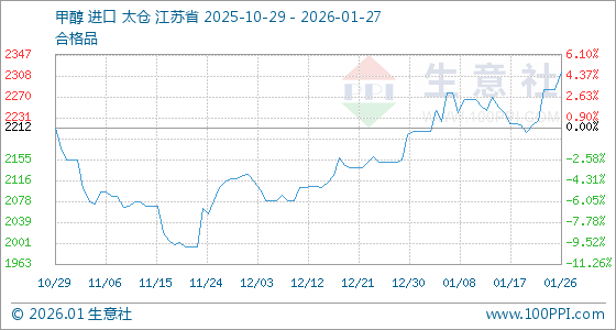 1月27日,生意社甲醇基准价为2315.00元/吨,与本月初(2207.50元/吨)相比,上涨了4.87%。