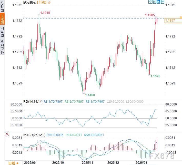 技术指标仍释放看涨信号:相对强弱指数RSI(14)呈上升趋势;指数平滑异同移动平均线(MACD)已实现信号线金叉并持续上行,进一步强化了看涨信号。但需警惕的是,汇价若无法有效突破1.1900关口,则不宜在该水位附近过度看涨。