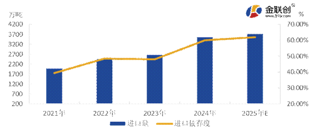 图3: 2021-2025年中国液化气进口量与进口依存度对比图