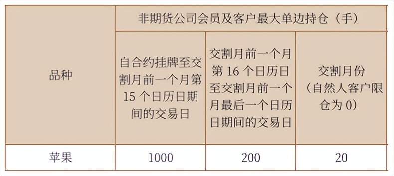 苹果期货参照现有品种限仓制度对非期货公司会员及客户实行梯度限仓,对于年贸易量超大型的企业,可通过申请套期保值头寸扩大持仓量以满足自身需求。
